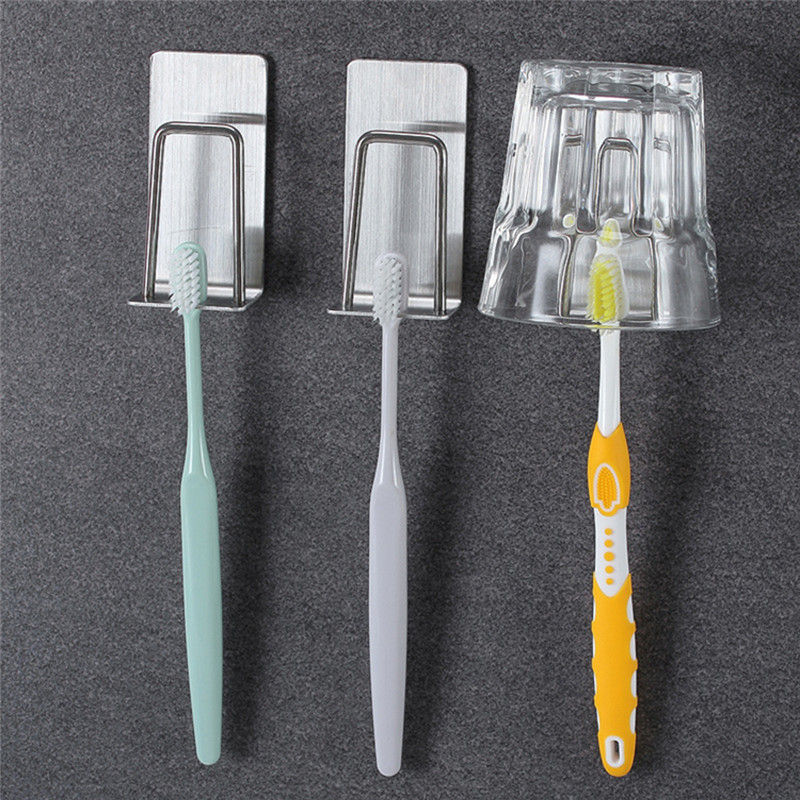 Twee tandenborstelhouders welke aan de muur bevestigd kunnen worden. In de houders zit een gleuf waarin een tandenborstel opgehangen kan worden en de opstaande rand bied ruimte voor een glas of tandpasta tube.
