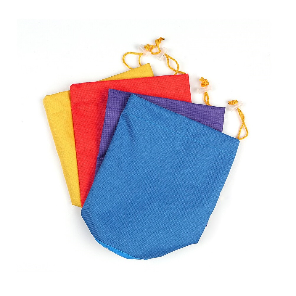 Vier filter zakken in de kleuren paars, geel, rood en blauw met een micron rating van 25, 73, 160 en 220.