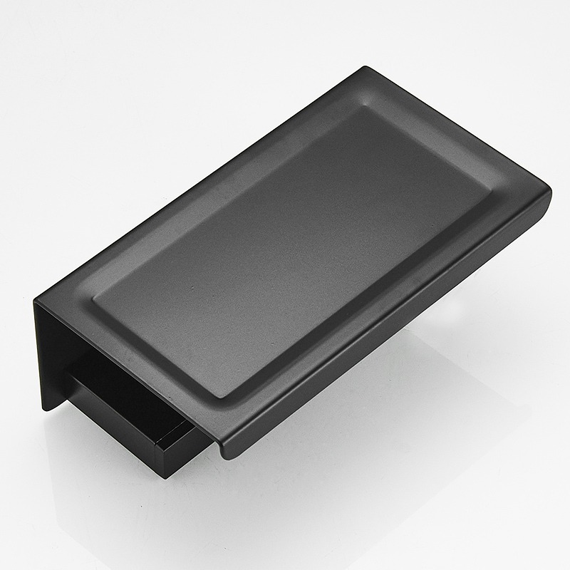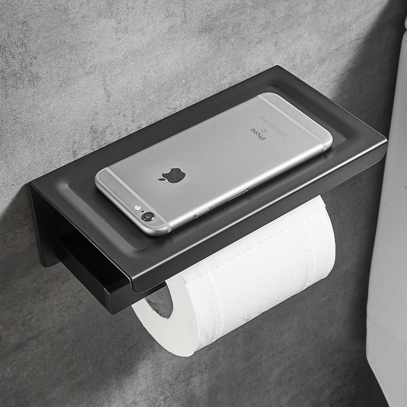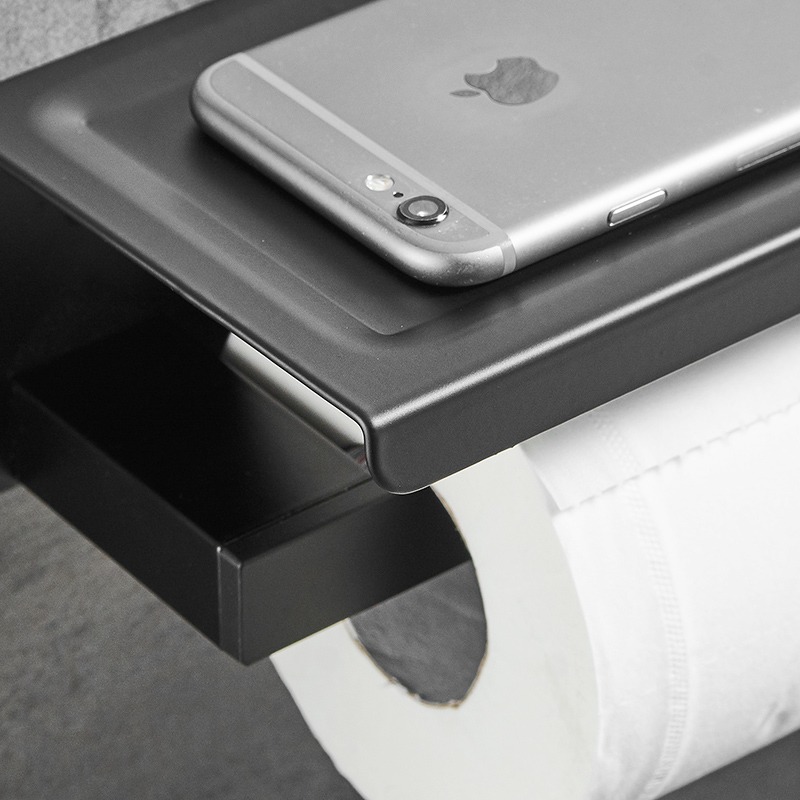 Een zwarte aluminium toiletrolhouder met bovenop een plankje om bijvoorbeeld uw smartphone op te leggen.