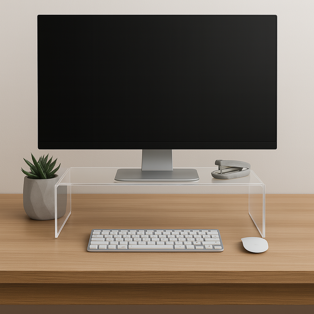 Deze transparante monitorstandaard combineert een strak design met praktische functionaliteit. Het verhoogt je beeldscherm naar een ergonomische kijkhoogte, waardoor nek- en rugklachten worden verminderd. Tegelijkertijd creëer je extra ruimte onder de standaard. Perfect om je toetsenbord, laptop of accessoires netjes op te bergen.