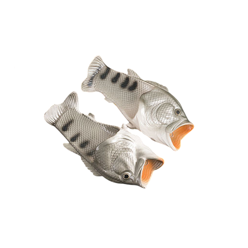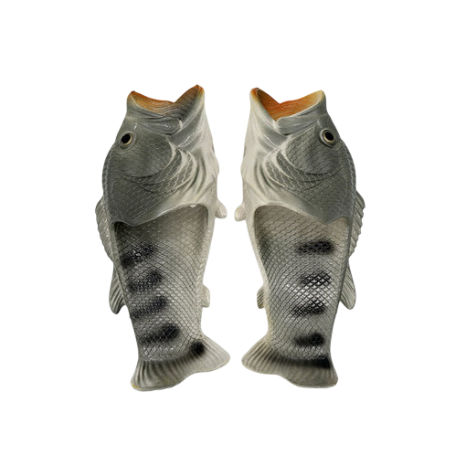 Een paar badslippers in de vorm van een karper. Schoenmaat 44-45.