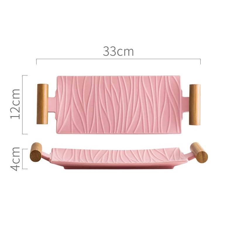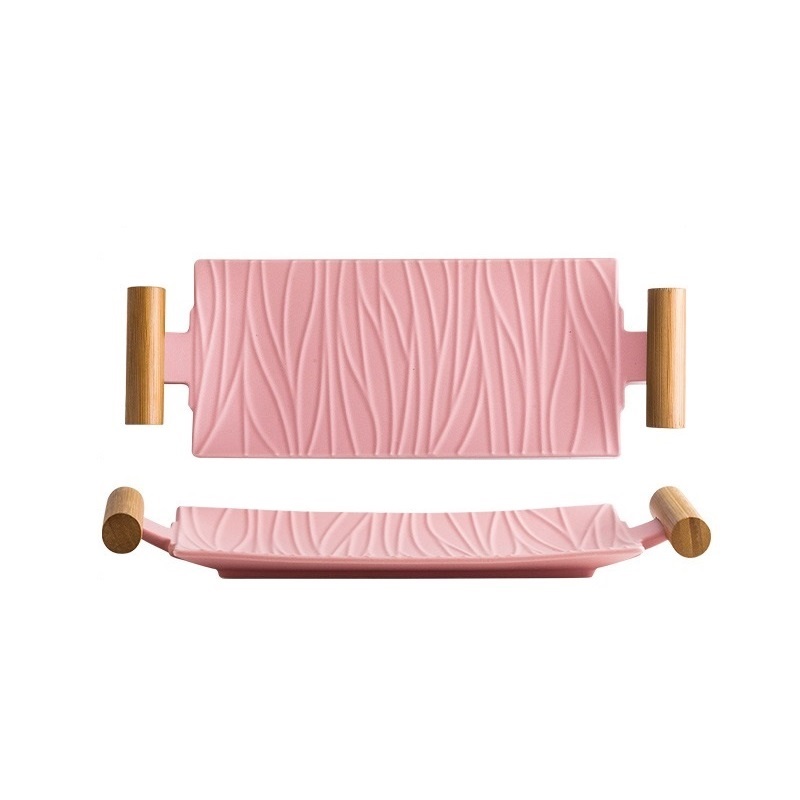 Eén langwerpig roze keramiek bord met handvatten. Bijvoorbeeld te gebruiken als sushi bord.