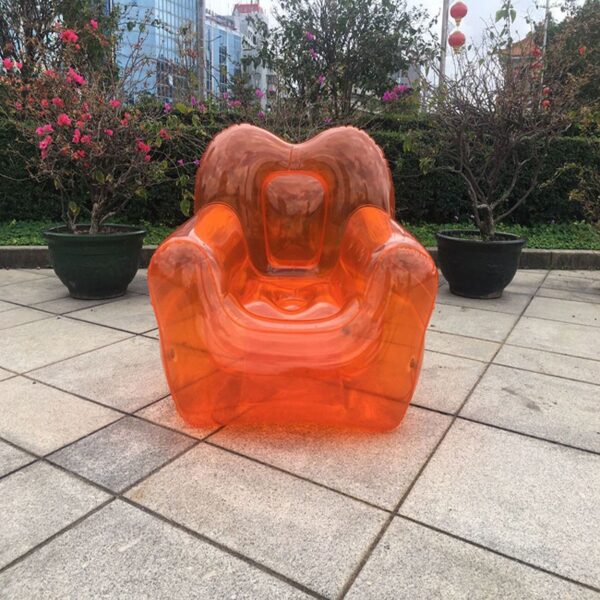 Een oranje opblaasstoel van ongeveer 90cm breed, 88 hoog en 70cm diep. Met een 35cm breed zitvlak op 35cm hoogte vanaf de grond.