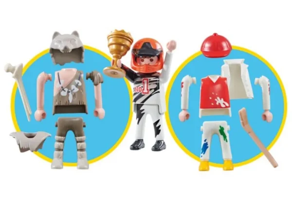 Leuk Playmobil Multi Play setje. Deze Playmobil speelfiguur kun je veranderen in een Playmobil holbewoner, Playmobil coureur of een Playmobil schilder. Inclusief bot, bokaal en kwast.