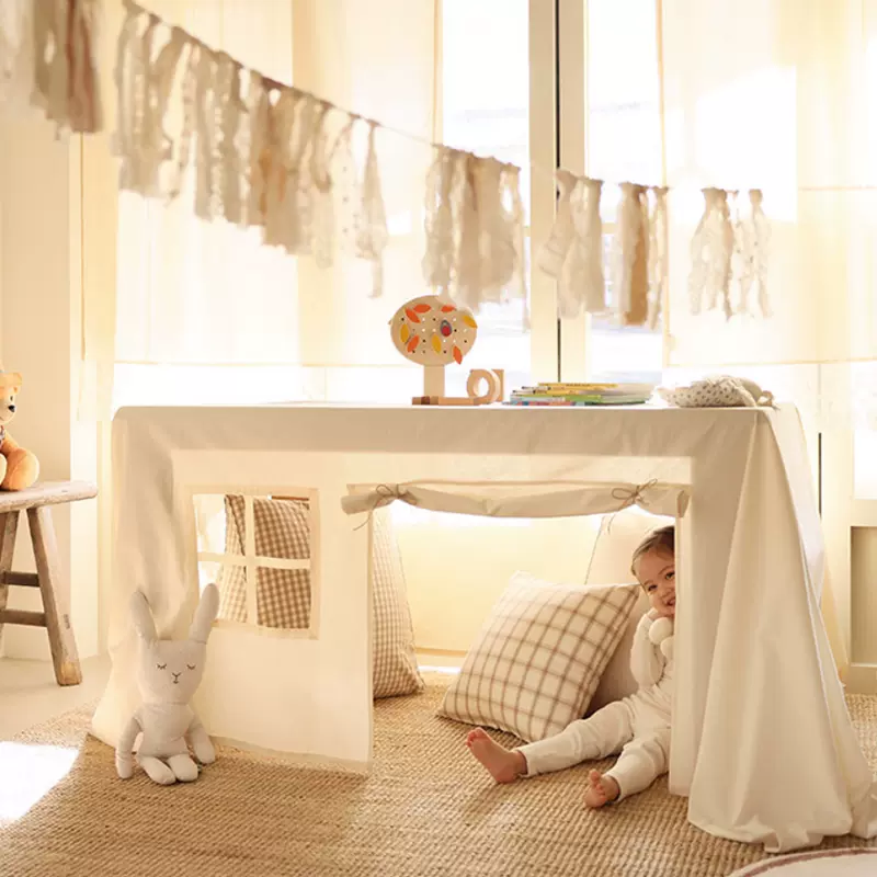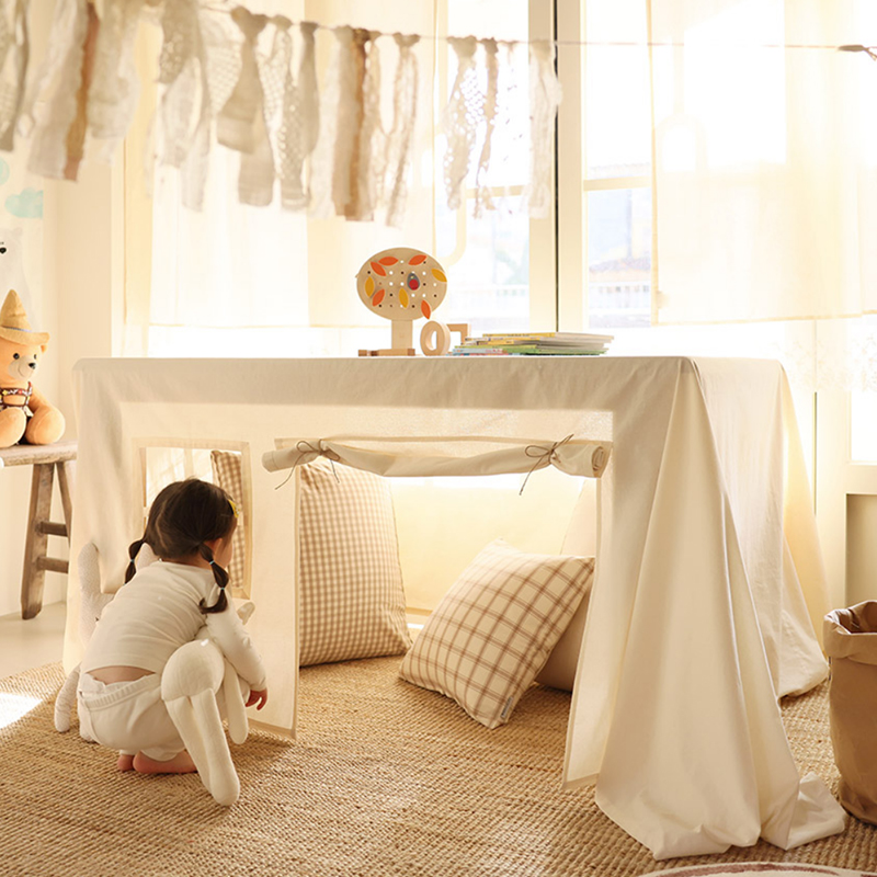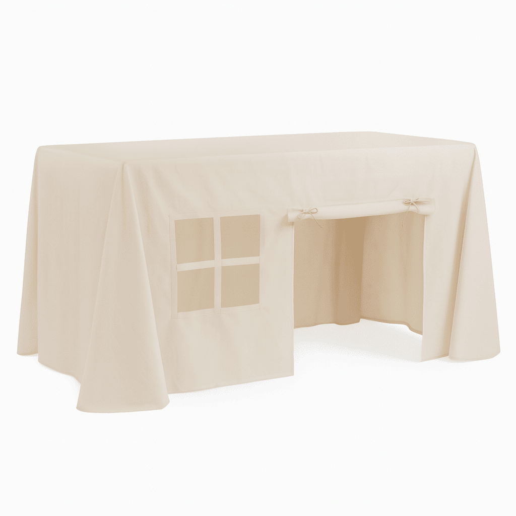 Met zijn grote doekmaat biedt deze tafeltent voldoende ruimte om een kleine tot middelgrote tafel volledig te bedekken, waardoor een verborgen speelplek ontstaat. Kinderen kunnen zich verstoppen, spelletjes spelen, lezen of gewoon genieten van hun eigen wereld onder de tafel.