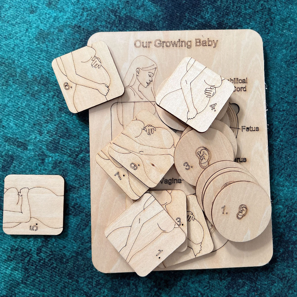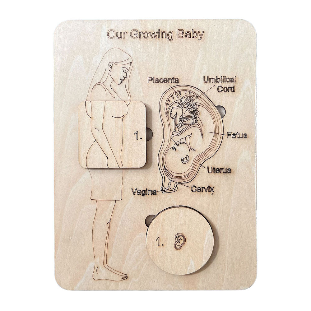 Een houten zwangerschap voorlichting bord welke 9 fases van zwangerschap weergeeft.